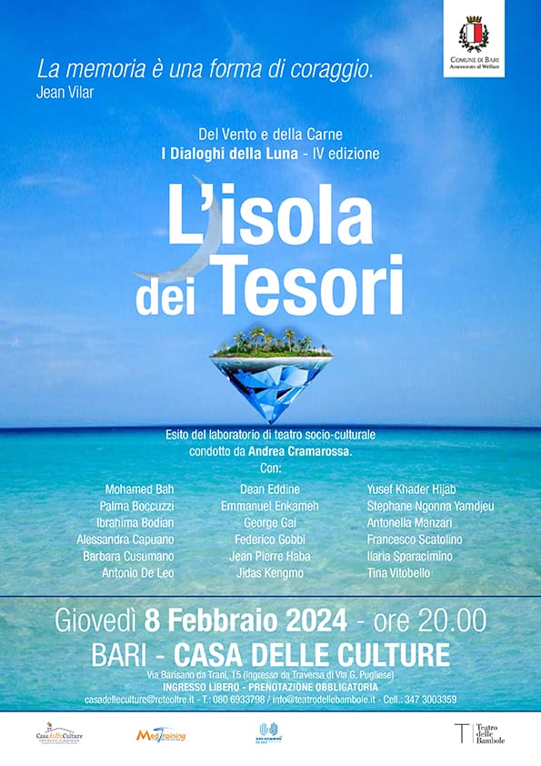Per la IV edizione de “I dialoghi della luna”l’8 febbraio è andato in scena lo spettacolo “L’isola dei tesori”, tra gli attori due nostri corsisti, Stéphane ed Eddine iscritti ai corsi di alfabetizzazione di lingua italiana.